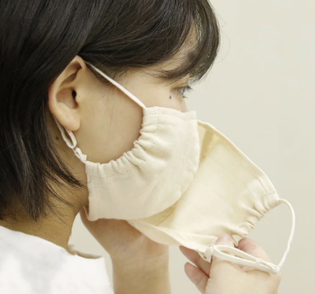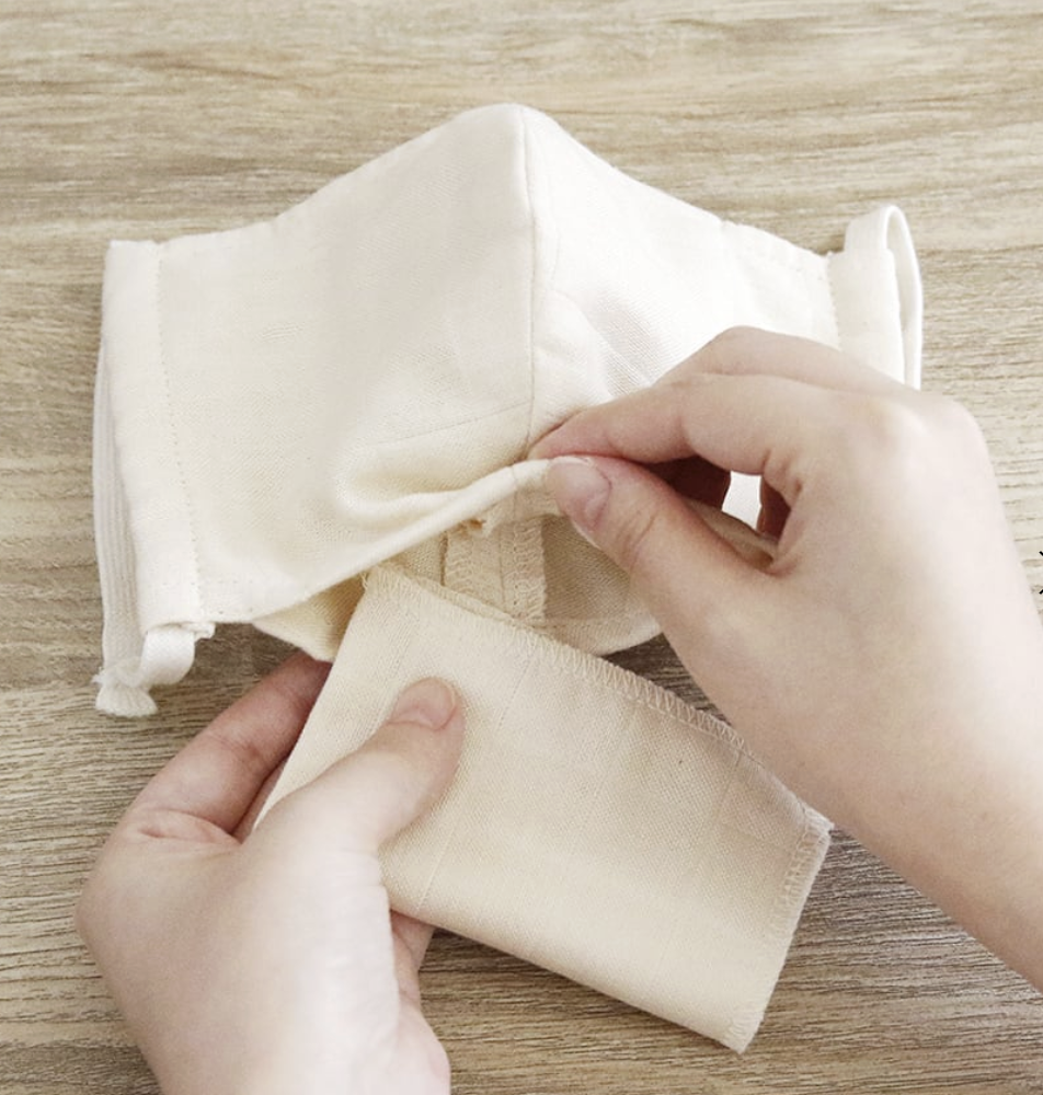 ポケット付きのマスクにフィルターを入れ、
